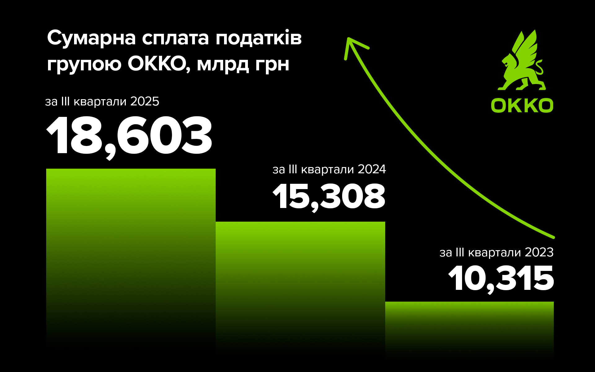 Група компаній ОККО заплатила 18 мільярдів 603 мільйони гривень податків і зборів за січень-вересень 2025 року. Це на 22% більше, ніж за аналогічний період торік і на 80% більше, ніж за аналогічний період 2023 року.