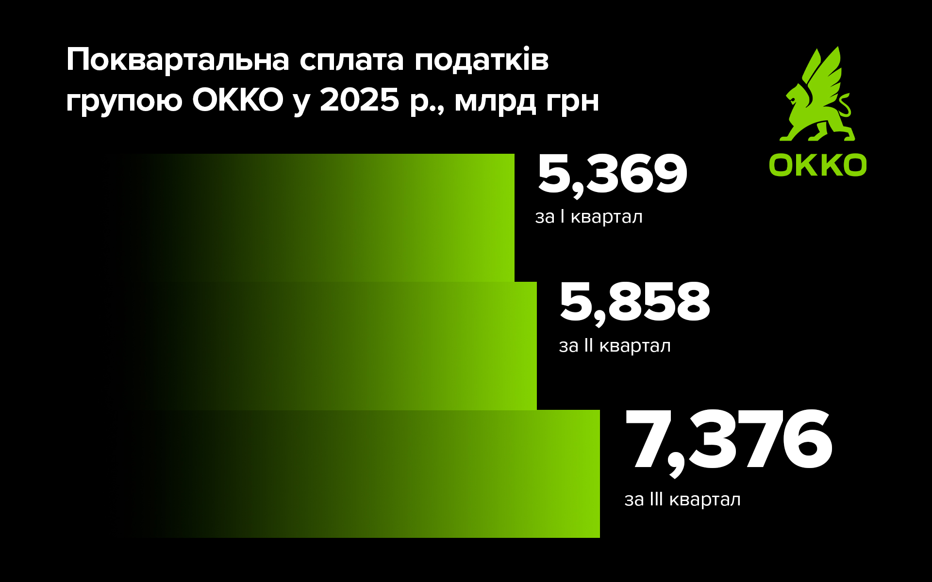 Упродовж 2025 року ОККО щоквартально нарощує обсяги коштів, перерахованих до бюджету. У першому кварталі було заплачено 5 мільярдів 369 мільйонів гривень, у другому – 5 мільярдів 858 мільйонів гривень, у третьому – 7 мільярдів 376 мільйонів гривень.